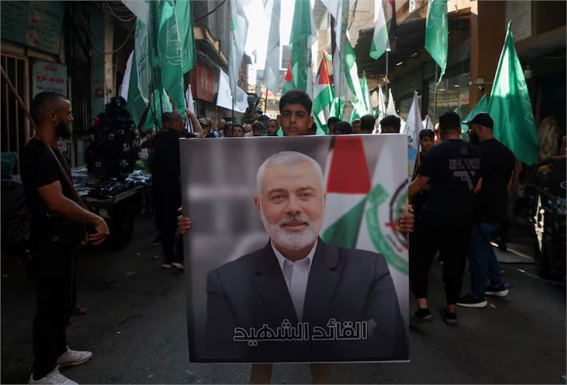 레바논 베이루트의 부르즈 알 바라즈네 팔레스타인 난민캠프에서 한 팔레스타인인이 이란에서 살해된 하마스 지도자 이스마일 하니예의 사진을 들고 그의 살해를 규탄하기 위한 행진을 벌이고 있다. (사진=Reuters)