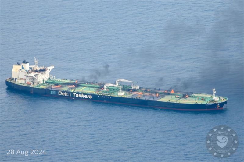 불꽃과 연기가 치솟고 있는 수니온호 (사진=로이터, 아스피데스 작전본부 X 제공)