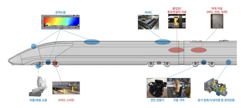 고속철도차량의 주요 소음원(청색)과 소음 차단 구조(적색)/현대로템 자료