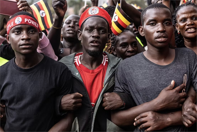 2026년 1월 12일 캄팔라에서 열린 선거 집회 중 보비 와인으로 알려진 우간다 야권 대통령 후보 로버트 캬굴라니 센타무(Robert Kyagulanyi Ssentamu)의 지지자들. SAMSON OTIENO / AP