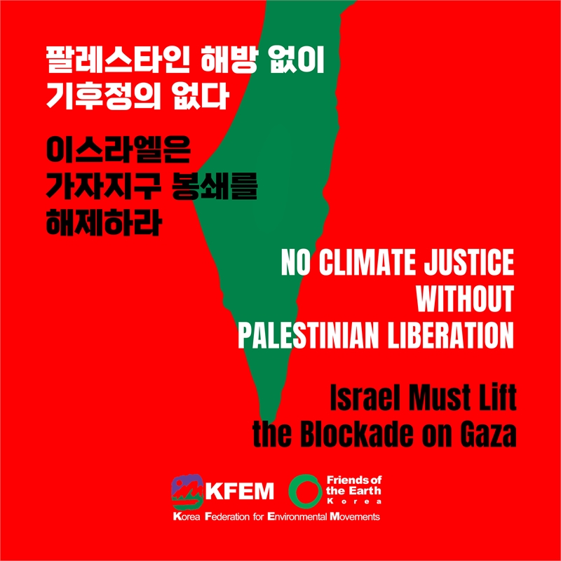 한국 지구의 벗 환경운동연합이 12일 이스라엘의 가자지구 봉쇄 해제를 촉구하는 성명서를 발표했다.환경운동연합은 이날 성명을 통해 "팔레스타인 해방 없이 기후정의도 없다"며 이스라엘 정부의 가자지구 봉쇄 해제와 한국 정부의 이스라엘 무기 수출 중단을 요구했다. 성명서에 따르면 9일 팔레스타인 가자지구에 1톤의 구호 물품을