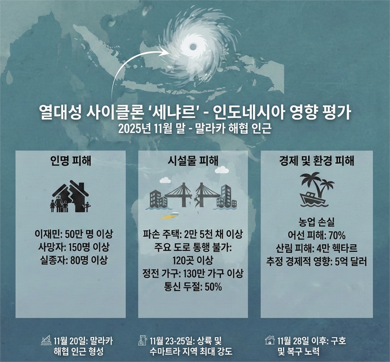 11월 말부터 12월 초까지 인도네시아 수마트라섬 북부를 강타한 대홍수와 산사태로 744명이 숨지고 551명이 실종됐다. 110만 명 이상이 집을 잃은 이번 재난은 135년 만에 형성된 열대성 사이클론과 무분별한 산림 파괴가 결합된 '복합 재난'으로, 인도네시아 현대사 최악의 참사 중 하나로 기록됐다.◆ 기상 이변과 생