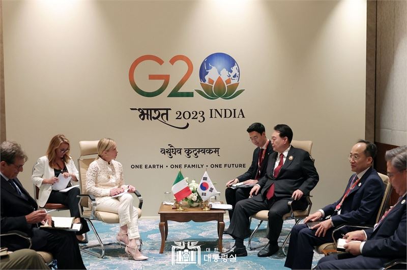 2023년 9월 10일 G20 정상회의 참석을 위해 인도 뉴델리를 방문한 윤석열 대통령이 조르자 멜로니(Giorgia Meloni) 이탈리아 총리와 정상회담을 하는 모습 (사진=대통령실)