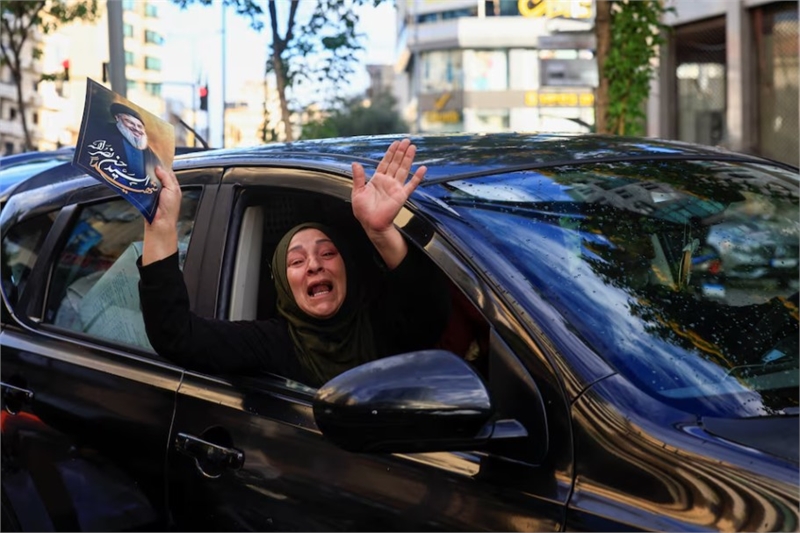 헤즈볼라 지도자 고(故) 사이드 하산 나스랄라의 사진을 들고 휴전을 기뻐하는 레바논 주민 (사진=로이터통신)