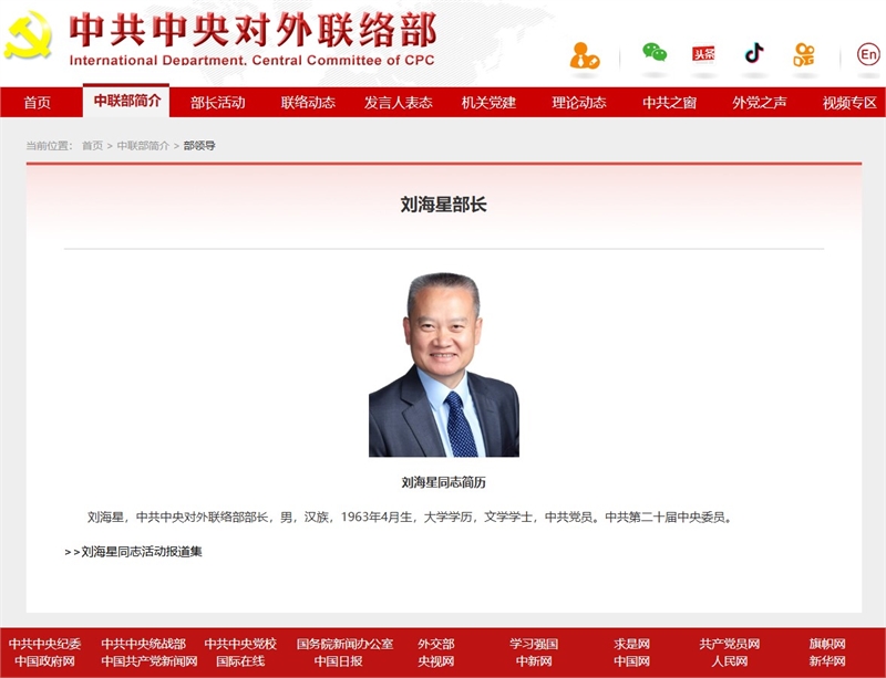 류하이싱 신임 부장/중국공산당 대외연락부 홈페이지 캡춰